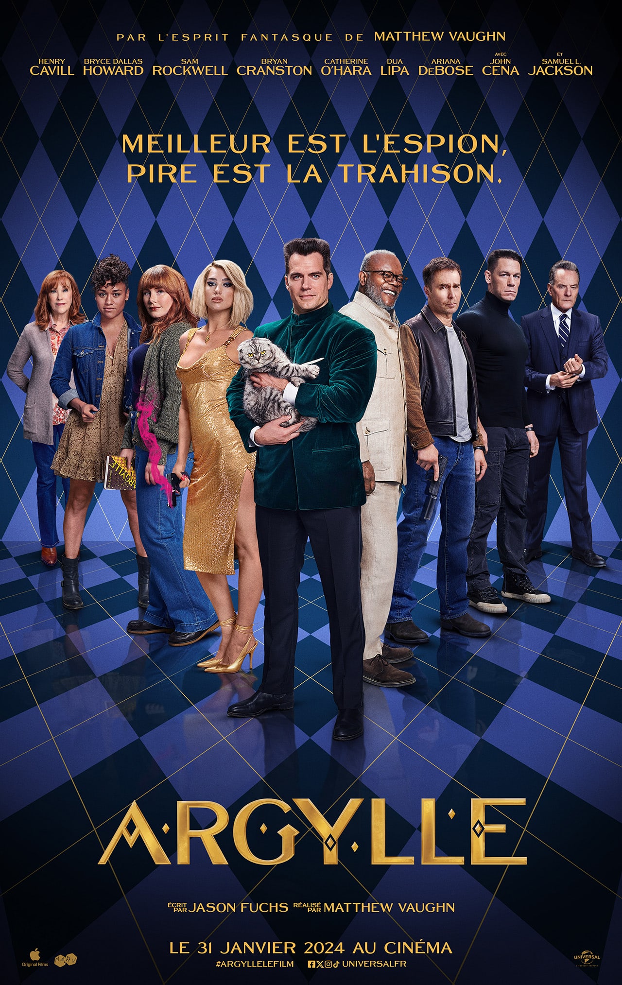 Synopsis : Elly Conway est l’auteure solitaire d’une série de romans d’espionnage à succès, dont l’idée du bonheur se résume à une soirée tranquille à la maison avec son ordinateur et son chat, Alfie. Mais lorsque les intrigues de ses livres, centrés sur l’agent secret Argylle et son combat pour démanteler un réseau d’espions mondial, commencent à ressembler étrangement aux opérations secrètes d’une véritable organisation d’espions, sa tranquillité ne devient plus qu’un souvenir. Aux côtés d’Aidan, un espion pourtant allergique aux chats, Elly n’hésite pas à embarquer Alfie dans son sac à dos pour mieux se lancer dans une course contre la montre aux quatre coins de la planète afin de distancer de dangereux tueurs et empêcher ses fictions de dépasser la réalité.