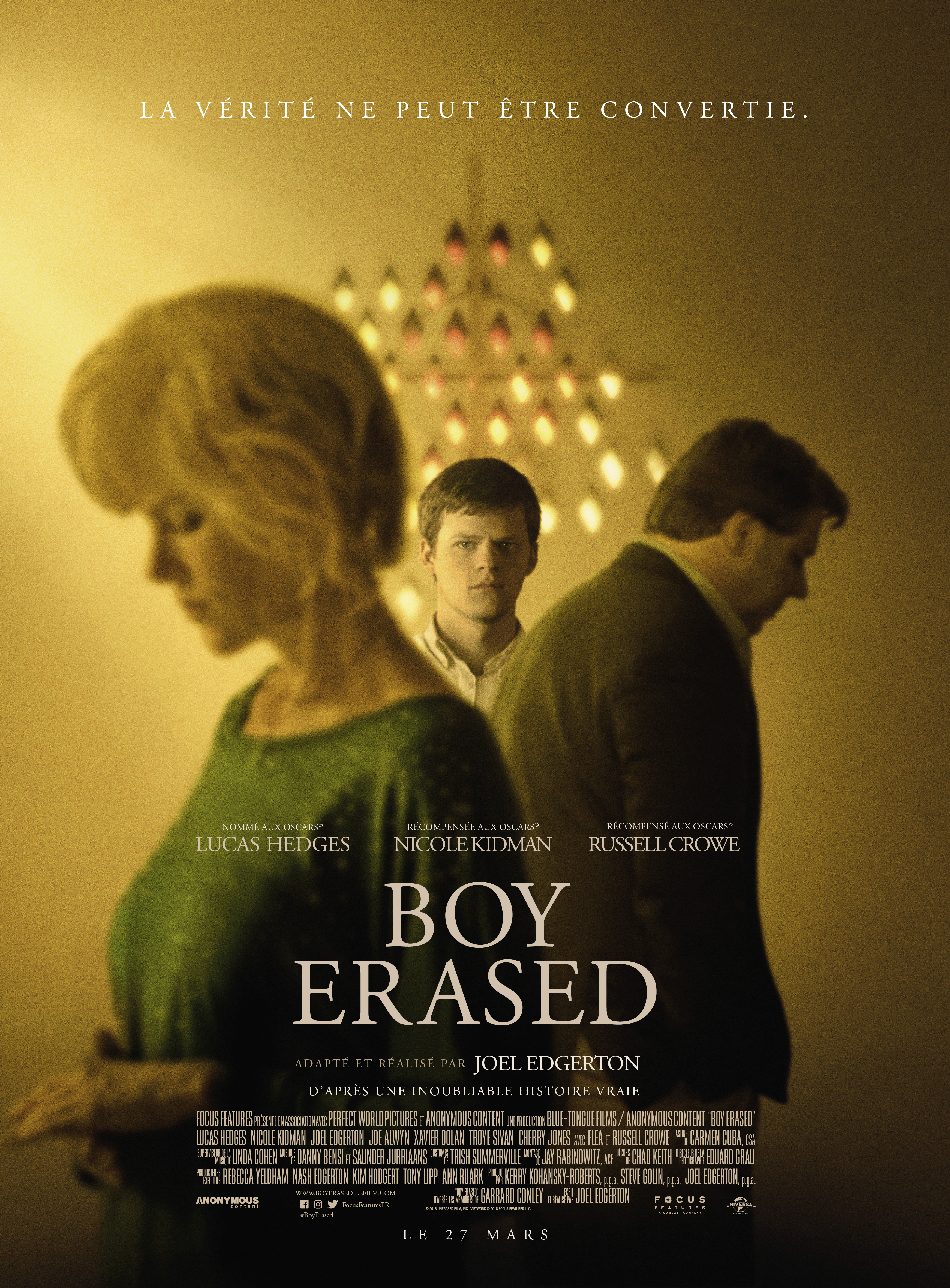 Synopsis : Jared (Lucas Hedges), fils d’un pasteur dans une petite ville américaine, dont l’homosexualité est dévoilée à ses parents (Nicole Kidman et Russell Crowe) à l’âge de 19ans. Jared fait face à un dilemme : suivre un programme de thérapie de reconversion – ou être rejeté pour toujours par sa famille, ses amis et sa communauté religieuse. BOY ERASED est l’histoire vraie du combat d’un jeune homme pour se construire alors que tous les aspects de son identité sont remis en question.