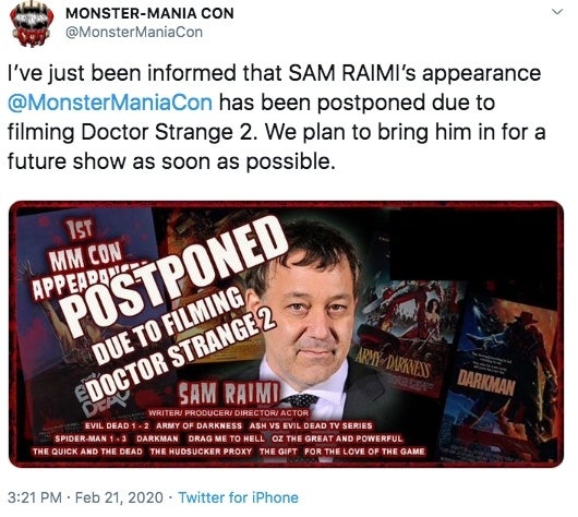Just been informed that SAM RAIMI is forced to postpone his appearance @MonsterManiaCon due to filming. We hope to have him at one of our future shows. pic.twitter.com/hgdbRysiG7