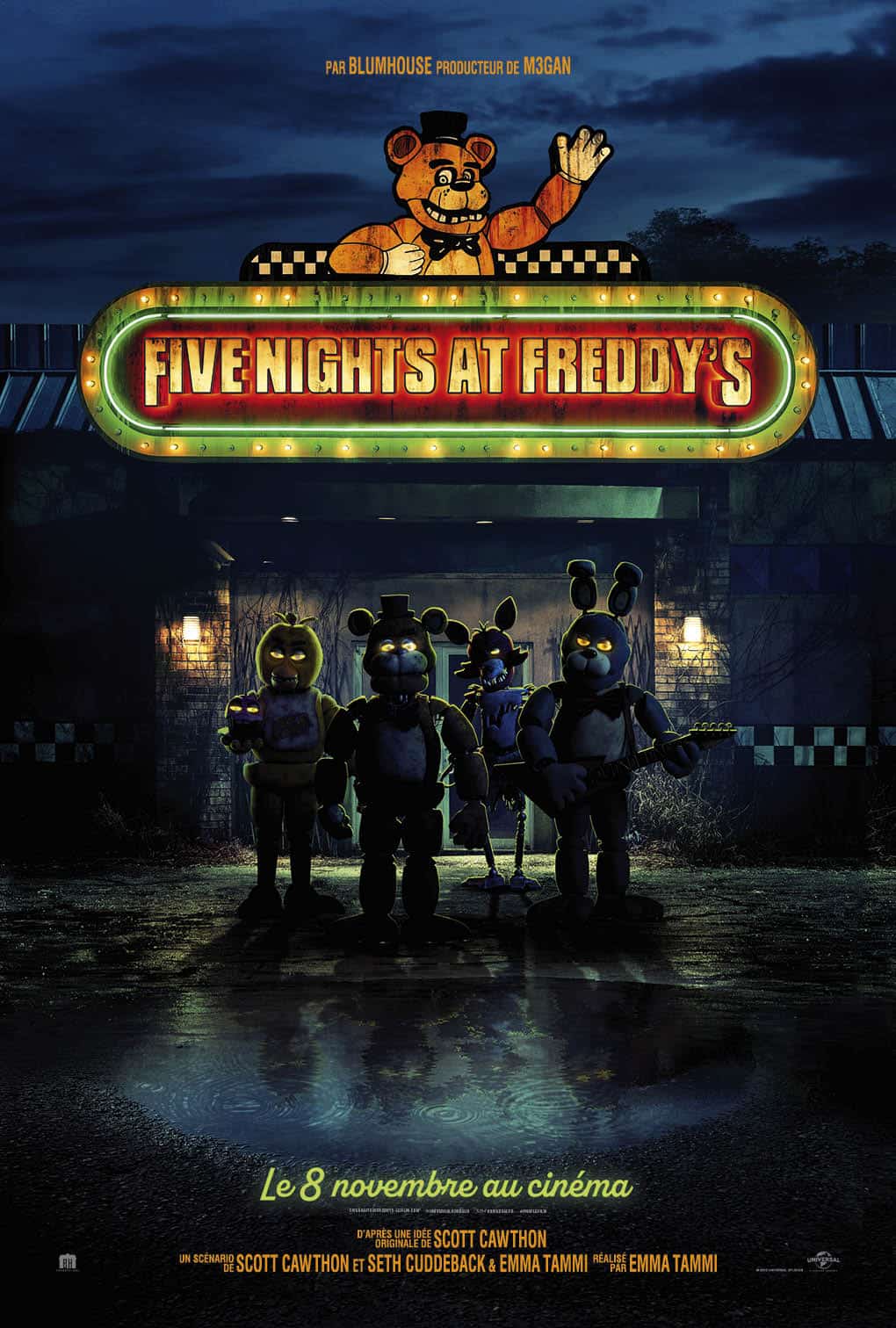 Synopsis : Il a 5 nuits pour survivre. Véritable phénomène, le jeu vidéo aussi célèbre que terrifiant arrive sur vos écrans. Blumhouse — à qui on doit M3GAN, BLACK PHONE et INVISIBLE MAN — vous offre une version angoissante de FIVE NIGHTS AT FREDDY’S. Le film met en scène la prise de service d’un agent de sécurité dans la pizzeria de Freddy Fazbear. Lors de cette première nuit, il se rend compte que les nuits chez Freddy ne sont pas de tout repos et qu’il pourrait bien ne pas revoir le jour.