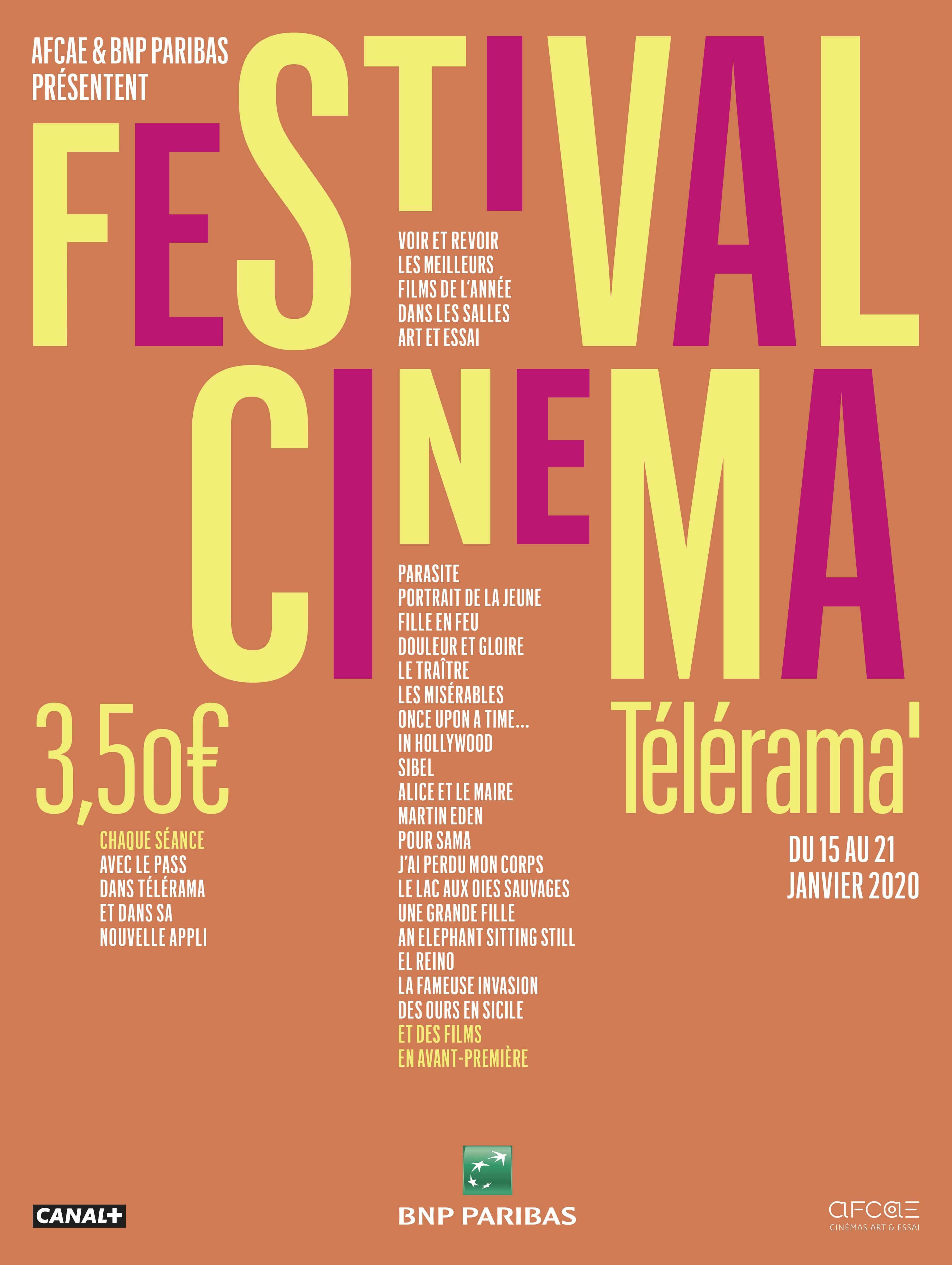 Le Festival Cinéma Télérama revient cette année, du 15 au 21 janvier 2020, pour voir et revoir les meilleurs films de l’année 2019 dans 400 salles art et essai. Chaque séance est au prix de 3,50 € avec le pass dans Télérama des 8 et 15 janvier et sur sa nouvelle application.