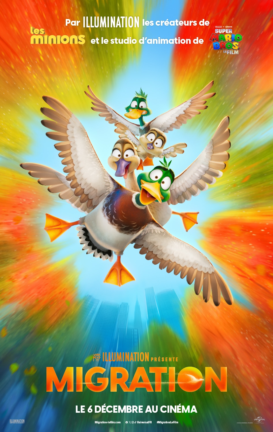 Le nouveau long-métrage des studios Illumination, a été confié à un français, Benjamin Renner, à qui l’on doit Ernest et Célestine et Le Grand Méchant Renard et autres contes. Première fois pour un français d’être à la tête d’un tel film pour le studio Illumination. Chris Meledandri, PDG de Illuminations, souhaitait une nouvelle histoire et des nouveaux personnages. Cette aventure a été folle, Renner habitué à la 2D a dû s’adapter à la 3D. Cette histoire est écrite par Benjamin Renner et Mike White. On doit notamment à White certains épisodes de « Dawson » et « Freaks & Geeks », de « Rock Academy » et « Pitch Perfect 3 »; mais il est surtout connu en tant que créateur et auteur de la série à succès « The White Lotus ». Par ailleurs, Renner co-réalise le film avec Guylo Homsy, qui a travaillé sur les franchises phares du studio. Les deux réalisateurs ont fait attention à la façon dont les canards et les oiseaux étaient représentés dans le film, avec l’ambition d’être aussi précis que possible. Beaucoup de recherches ont été effectuées, notamment sur la phase migratoire et des colverts ont même été amenés dans le studio d’animation. Enfin, côté voix françaises, Laure Calamy et Pio Marmai ont été appelés pour être les parents dans cette aventure folle. Si il y a eu énormément d’attention pour réaliser ce film, « Migration » est-il un grand film d’animation des studios Illumination ? Voici mon avis.