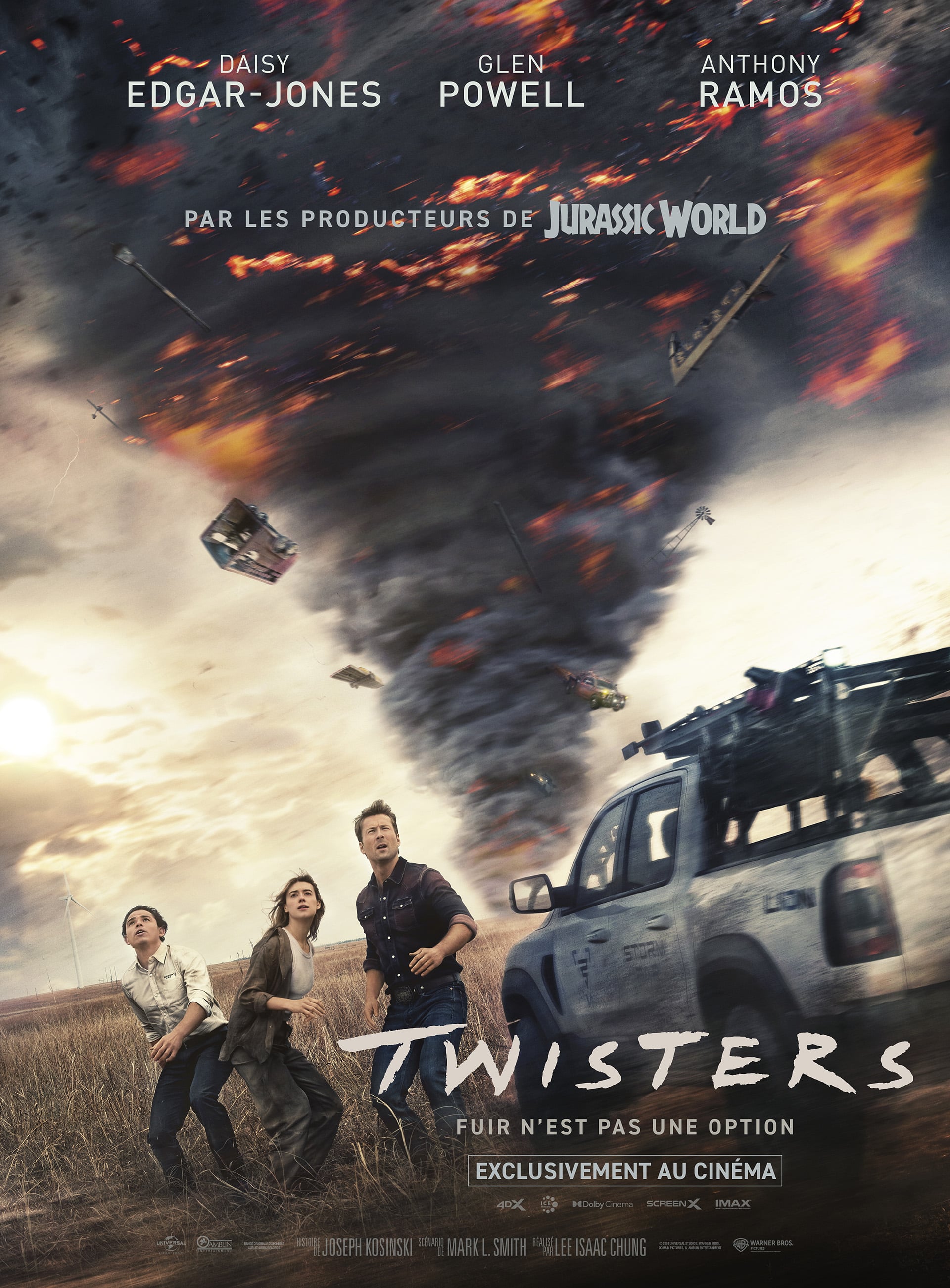 L’annonce de Twisters a été surprenante mais n’est ni un reboot, ni un prequel, ni une suite de Twister, mais un nouveau chapitre comme il a été annoncé. Initialement, Joseph Kosinski devait le réaliser mais Lee Isaac Chung a été engagé pour sa réalisation avec un nouveau casting : Glenn Powell, star montante depuis « Top Gun Maverick » et Daisy edgar Jones qu’on a pu découvrir dans le film « Là où chantent les écrevisses » ou la série « la guerre des mondes. Contrairement aux 92 millions de dollars de Twister de 1996, il a obtenu un budget de 200 millions de dollars. Ce budget plus important permet de développer un visuel proche de la réalité pour cette nouvelle aventure dont le tournage à duré 60 jours. Cependant, si Jan De bont, réalisateur de Twister, n’a pas été consulté, l’histoire de ce nouveau chapitre s’est inspirée de l’histoire Powell avec les tornades dont il a vécu un évènement lié en 1997. Chung n’a pas hésité également à chercher des conseils auprès de spécialistes durant le tournage ou avant, et s’est également inspiré des films French Connection (1971) et 60 secondes chrono (2000) pour les scènes de course poursuites. Enfin, si Twisters a été tourné sur pellicule 35 mm pour l’image, et eu certains inconvénients dans le montage; est-ce que ce nouveau chapitre est t-il réussi ? Voici mon avis.
